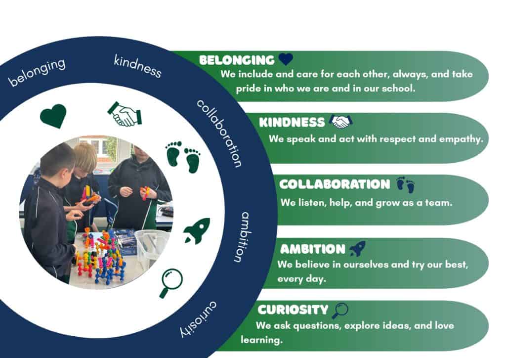 Grounded in our values of belonging, kindness, curiosity, collaboration, and ambition, we create a safe and inclusive environment where children feel known, valued, and empowered to thrive. We encourage pupils to embrace challenges, work together with respect, and develop the skills and character to succeed both within school and beyond.